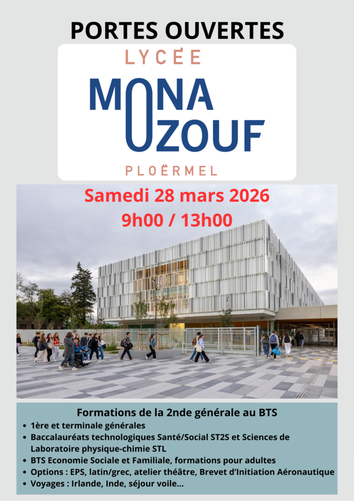 Le Lycée Mona Ozouf ouvre ses portes le samedi 28 mars 2026 de 9h à 13h.